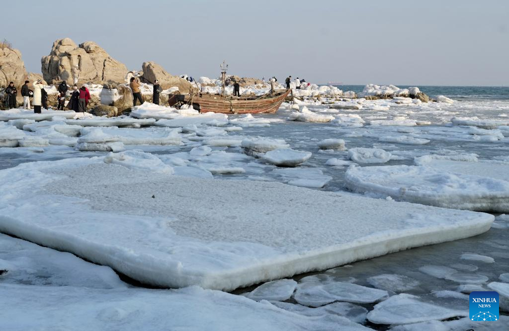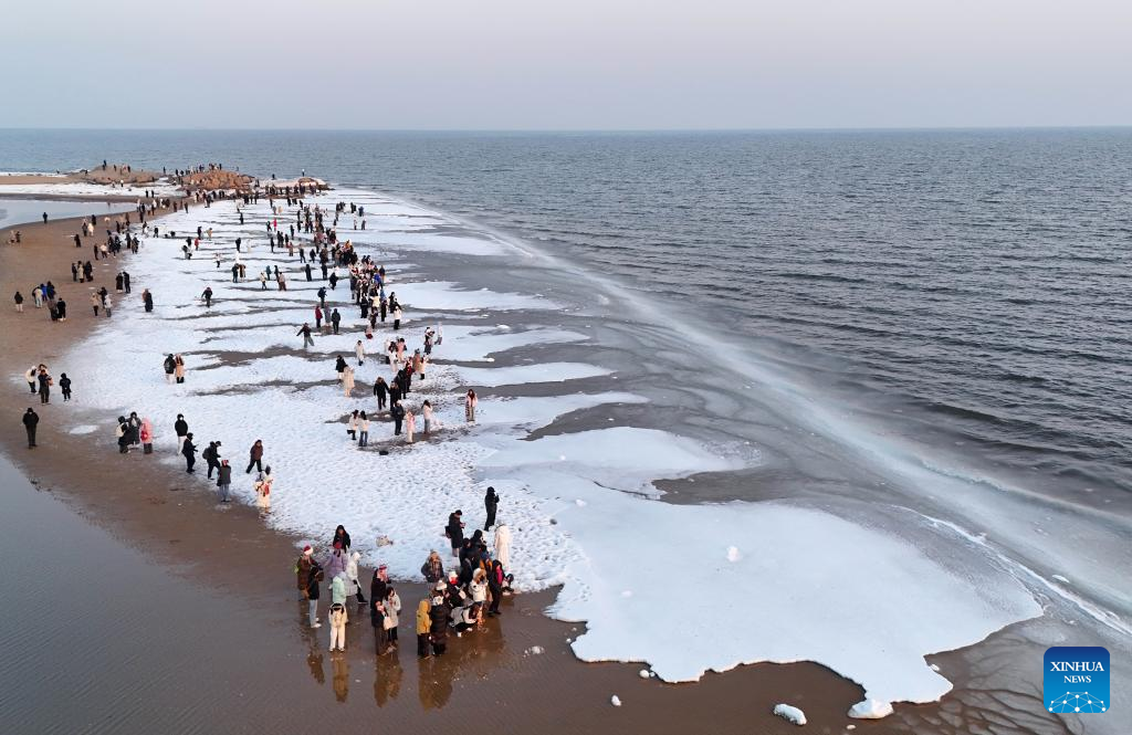 Tourists visit a beach covered with sea ice in Beidaihe District of Qinhuangdao, north China's Hebei Province, on Jan. 31, 2026. (Xinhua/Yang Shiyao)