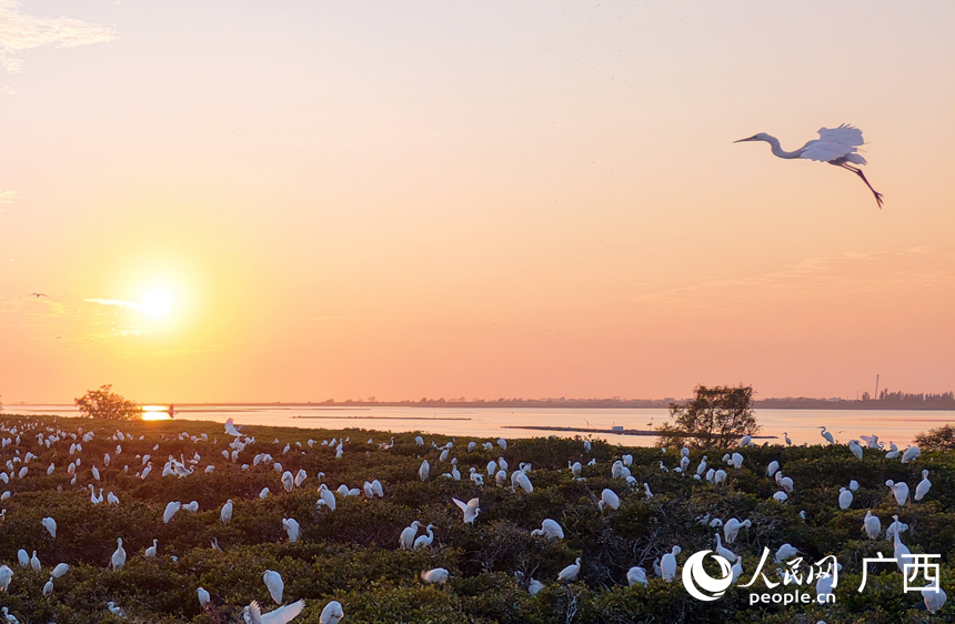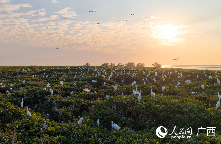 Large flocks of migratory birds, including egrets, spotted doves, and kingfishers, were recently seen in the mangrove forests on Qixing Island, Shagang township, Hepu county, south China's Guangxi Zhuang Autonomous Region.