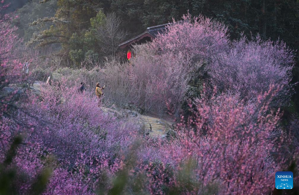 Tourists enjoy the plum blossoms in Maihuayu Villlage of Shexian County, east China's Anhui Province, on Feb. 9, 2026. (Xinhua/Zhou Mu)