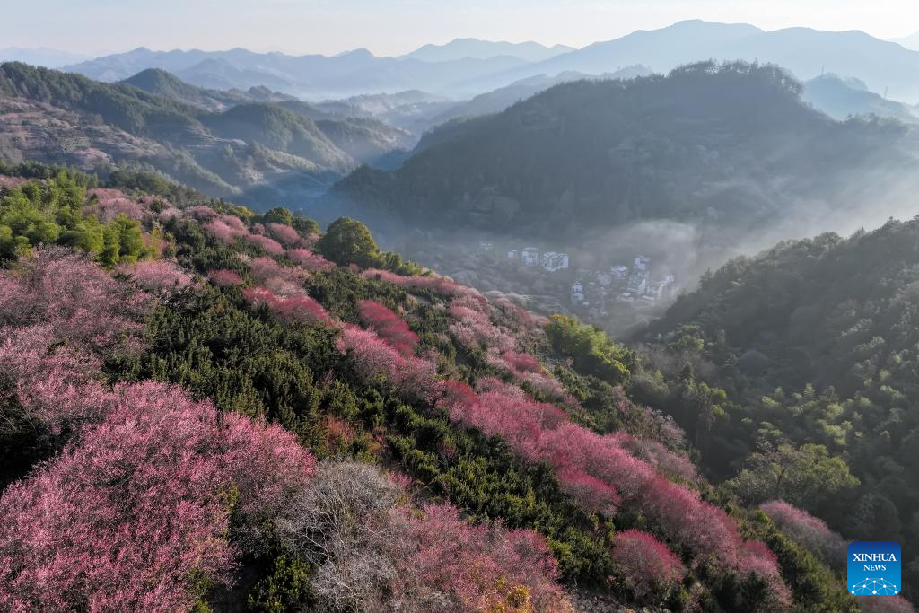An aerial drone photo taken on Feb. 9, 2026 shows the plum blossoms in Maihuayu Villlage of Shexian County, east China's Anhui Province. (Photo by Fan Chengzhu/Xinhua)