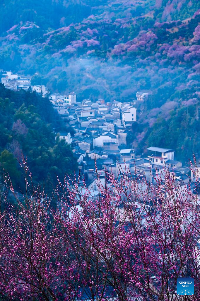 This photo taken on Feb. 9, 2026 shows the scenery of Maihuayu Villlage amid the plum blossoms in Shexian County, east China's Anhui Province. (Xinhua/Zhou Mu)