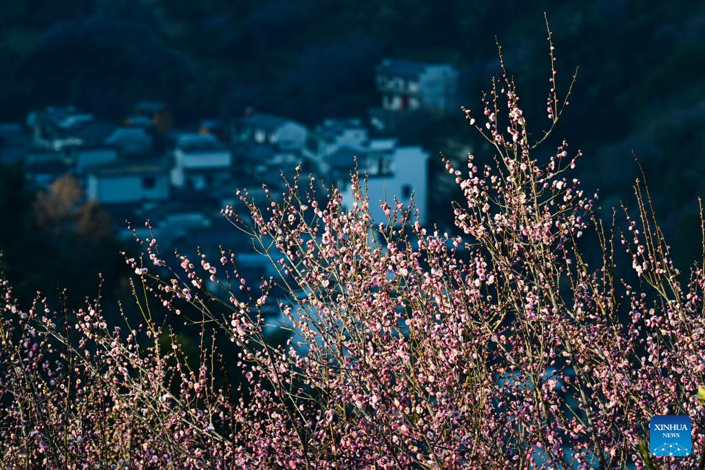 This photo taken on Feb. 9, 2026 shows the plum blossoms in Maihuayu Villlage of Shexian County, east China's Anhui Province. (Xinhua/Zhou Mu)