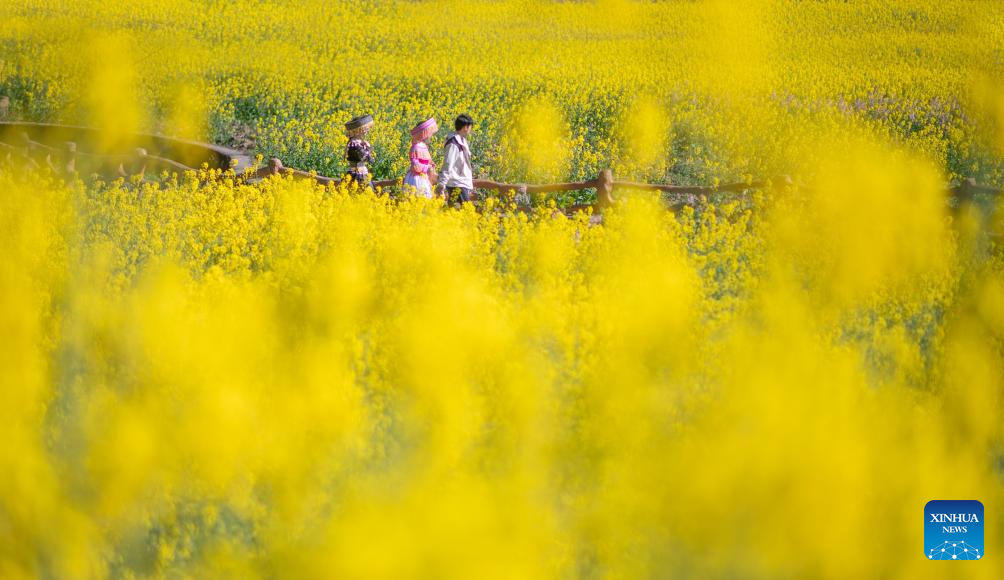 Tourists visit a rapeseed flower field in Tanba Village of Yusi Town, Luxian County, southwest China's Sichuan Province, Feb. 19, 2026. (Photo by Liu Xueyi/Xinhua)