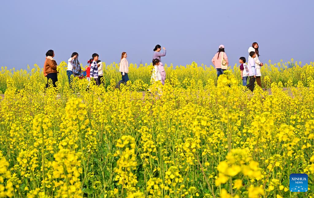Tourists visit a rapeseed flower field in Songjian Village of Songmen Town, Wenling City, east China's Zhejiang Province, Feb. 21, 2026. (Photo by Jiang Wenhui/Xinhua)