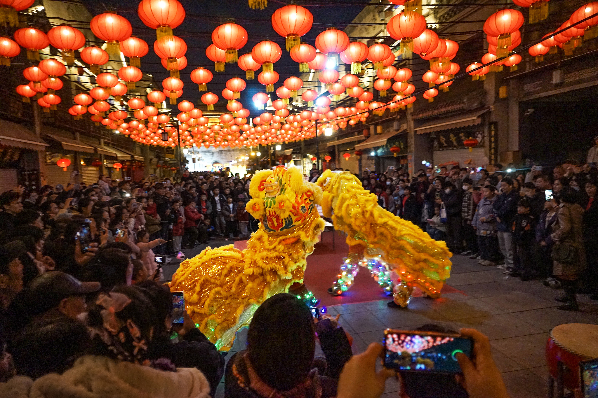Tourists watch a lion dance performance at Tianjin's Drum Tower, China, February 20, 2026. (Photo: VCG)