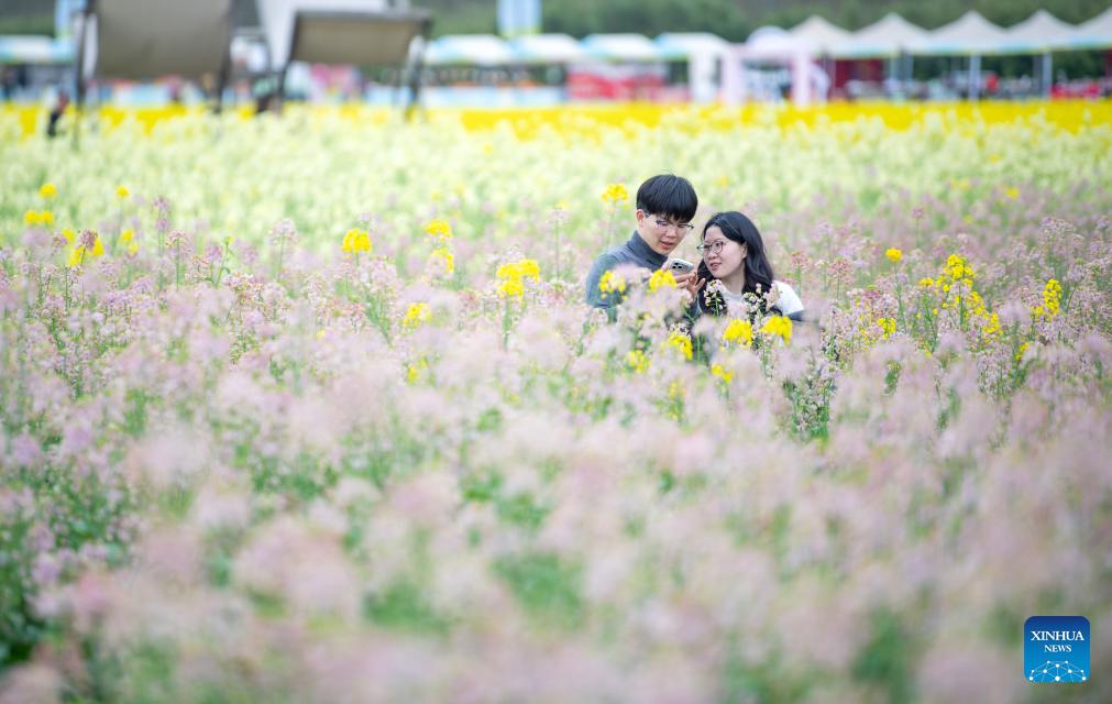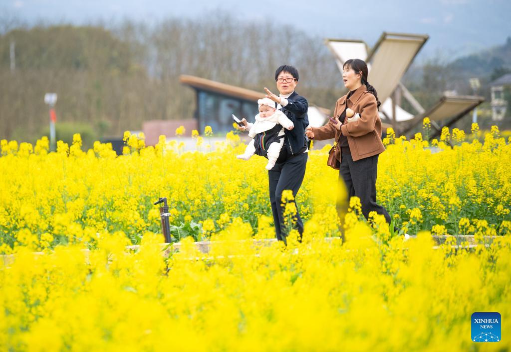 Tourists have fun in a rapeseed flower field at Jiangjun Village of Qitang Town, southwest China's Chongqing, March 9, 2026. (Xinhua/Tang Yi)