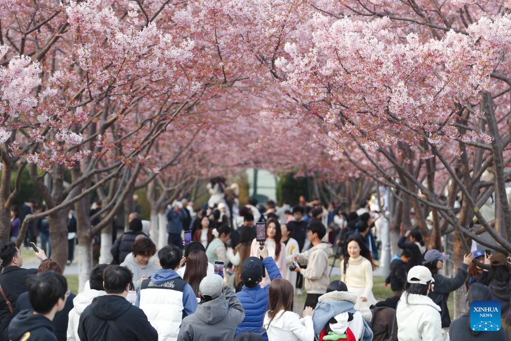 People view cherry blossoms in Yinzhou District of Ningbo, east China's Zhejiang Province, March 16, 2026. (Photo by Hu Jiajie/Xinhua)