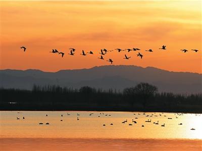 Swans fly over the Guanting Reservoir National Wetland Park in Zhangjiakou city, north China's Hebei Province. (Photo: People's Daily)