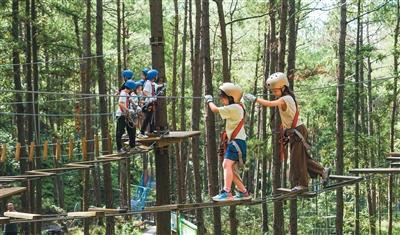 Children take on the thrills of an activity at a forest wellness tourism resort in Bazhong city, southwest China's Sichuan Province. (Photo: People's Daily)