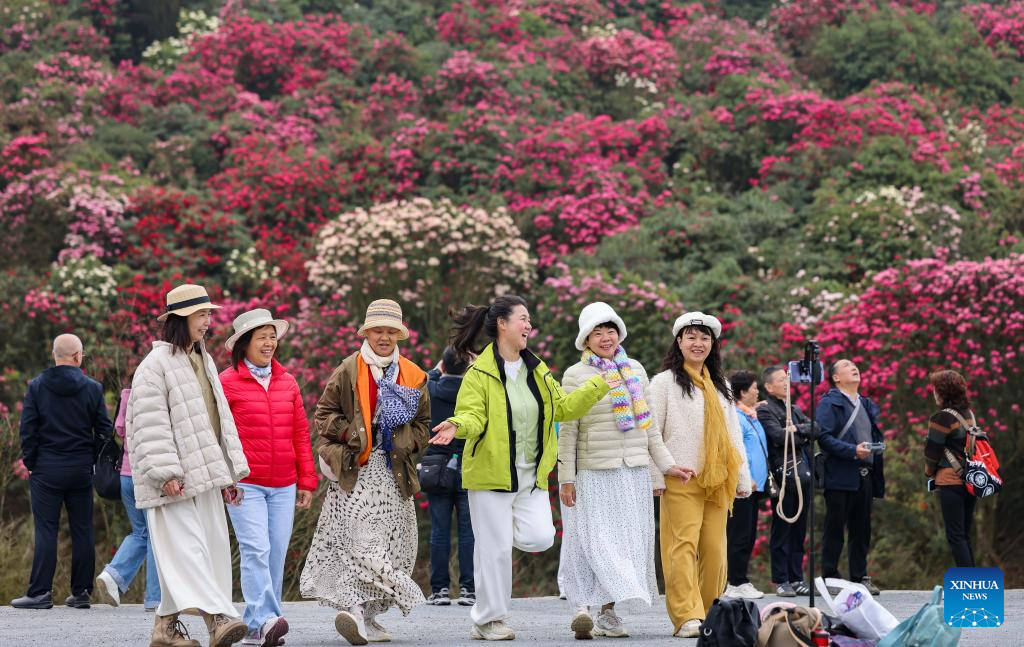 Tourists visit an azalea scenic area in Bijie City, southwest China's Guizhou Province, April 1, 2026. The azaleas in Bijie are currently in full bloom, drawing crowds of visitors. (Xinhua/Yang Wenbin)