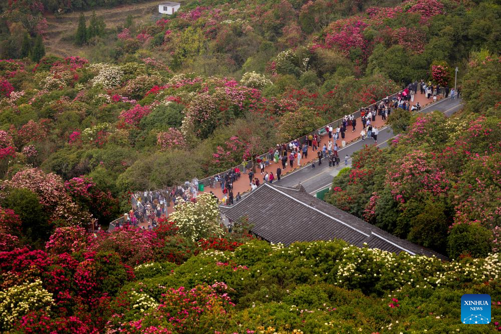 An aerial drone photo shows tourists visiting an azalea scenic area in Bijie City, southwest China's Guizhou Province, April 1, 2026. The azaleas in Bijie are currently in full bloom, drawing crowds of visitors. (Xinhua/Yang Wenbin)