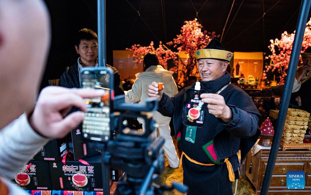 A staff member promotes goji berry puree products at a fair in Nyingchi City, southwest China's Xizang Autonomous Region, April 3, 2026.