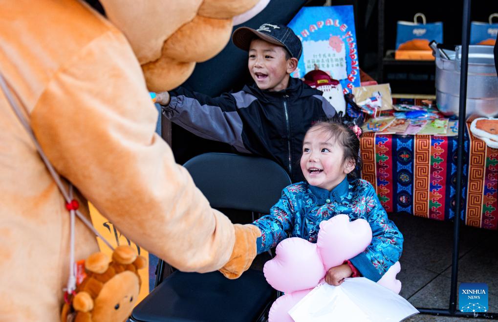 Children interact with a costumed performer at a fair in Nyingchi City, southwest China's Xizang Autonomous Region, April 3, 2026.