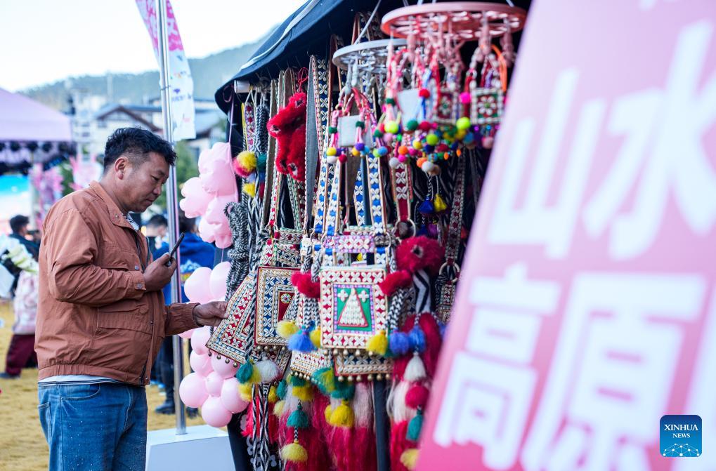 A tourist shops for handmade bags at a fair in Nyingchi City, southwest China's Xizang Autonomous Region, April 3, 2026.