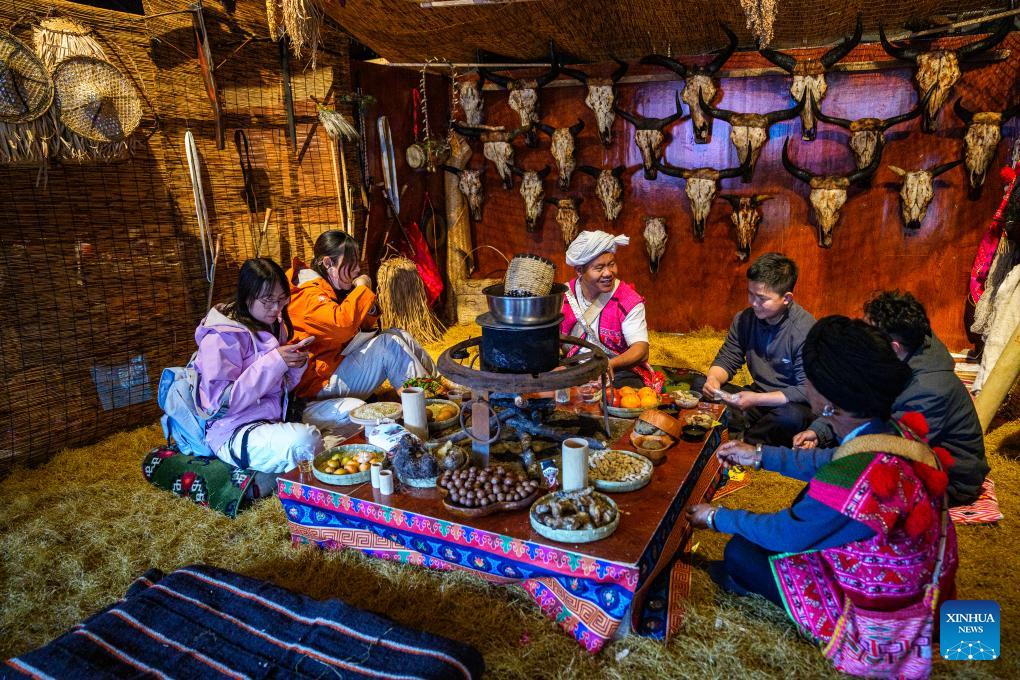 Tourists have fun in a tent themed on local folk culture at a fair in Nyingchi City, southwest China's Xizang Autonomous Region, April 3, 2026.