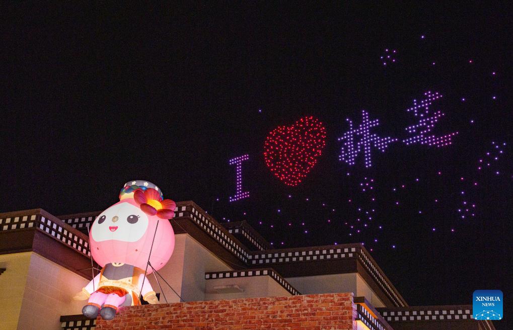 A drone light show is staged at the opening ceremony of a peach blossom tourism and cultural festival in Nyingchi City, southwest China's Xizang Autonomous Region, April 3, 2026.