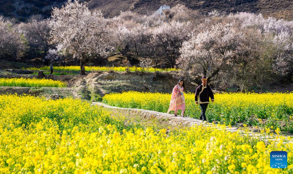 Tourists walk among blooming flowers in Duodang Village of Nyingchi City, southwest China's Xizang Autonomous Region, April 2, 2026.