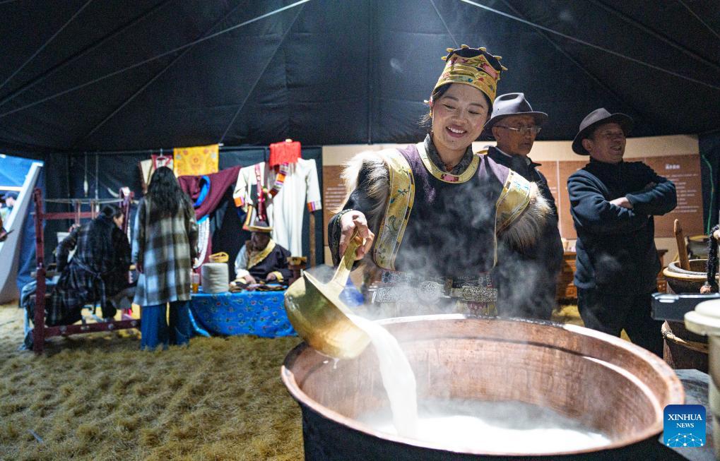 A staff member makes butter tea at a fair in Nyingchi City, southwest China's Xizang Autonomous Region, April 3, 2026.