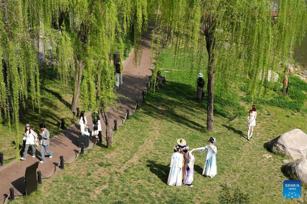 People enjoy the spring scenery at a wetland park in Xi'an, northwest China's Shaanxi Province, March 27, 2026. (Xinhua/Shao Rui)