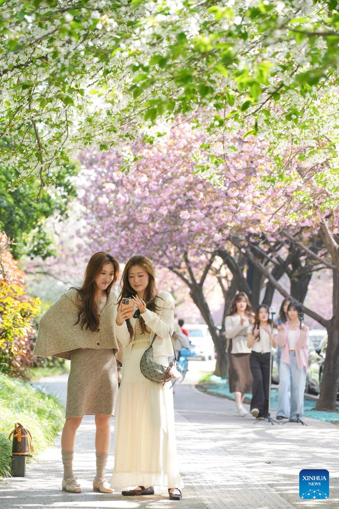 This photo taken on April 1, 2026 shows people taking photos on a road in Xi'an, northwest China's Shaanxi Province. (Xinhua/Shao Rui)