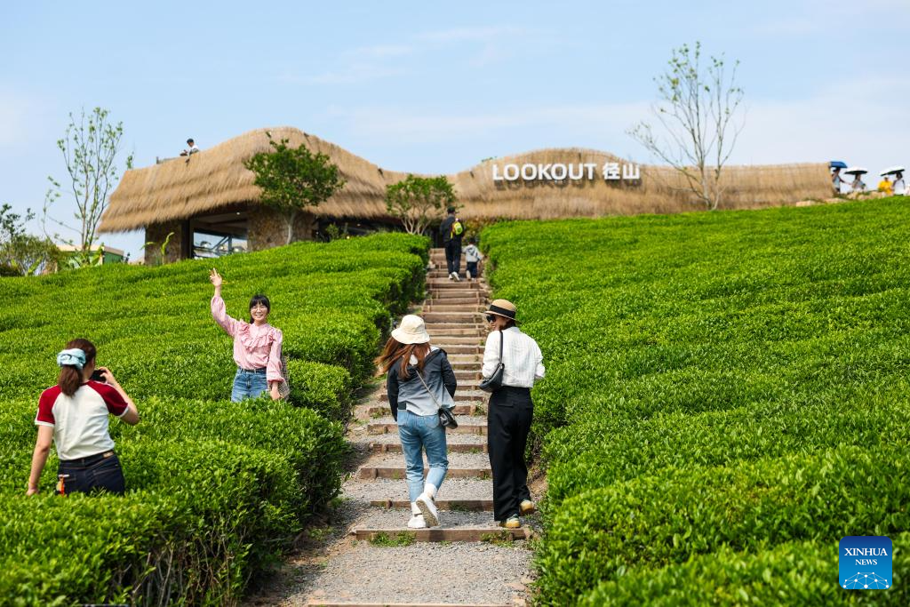 Tourists visit a tea garden in Xiaogucheng Village of Jingshan Town in Yuhang District of Hangzhou City, east China's Zhejiang Province, April 26, 2026. Currently, Hangzhou has developed a series of rural cultural tourism projects, attracting tourists for sightseeing and consumption, and infusing new vitality into the local "spring economy." (Xinhua/Jiang Han)