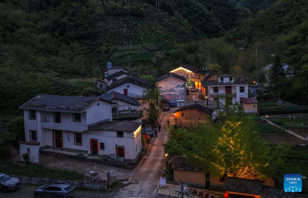 An aerial drone photo taken on April 24, 2026 shows a night view of Jinling Village in Pingmen Township of Chun'an County, east China's Zhejiang Province. Located over 1,000 meters above sea level, Jinling Village is one of the highest-altitude villages in Chun'an County. In recent years, the village has leveraged its rich natural resources to develop rural cultural and eco-friendly tourism. By improving infrastructures, building camping sites and viewing platforms, as well as promoting homestays, Jinling Village has gradually established an industry centering hiking, sightseeing and summer retreat, boosting income for local villagers. (Xinhua/Xu Yu)