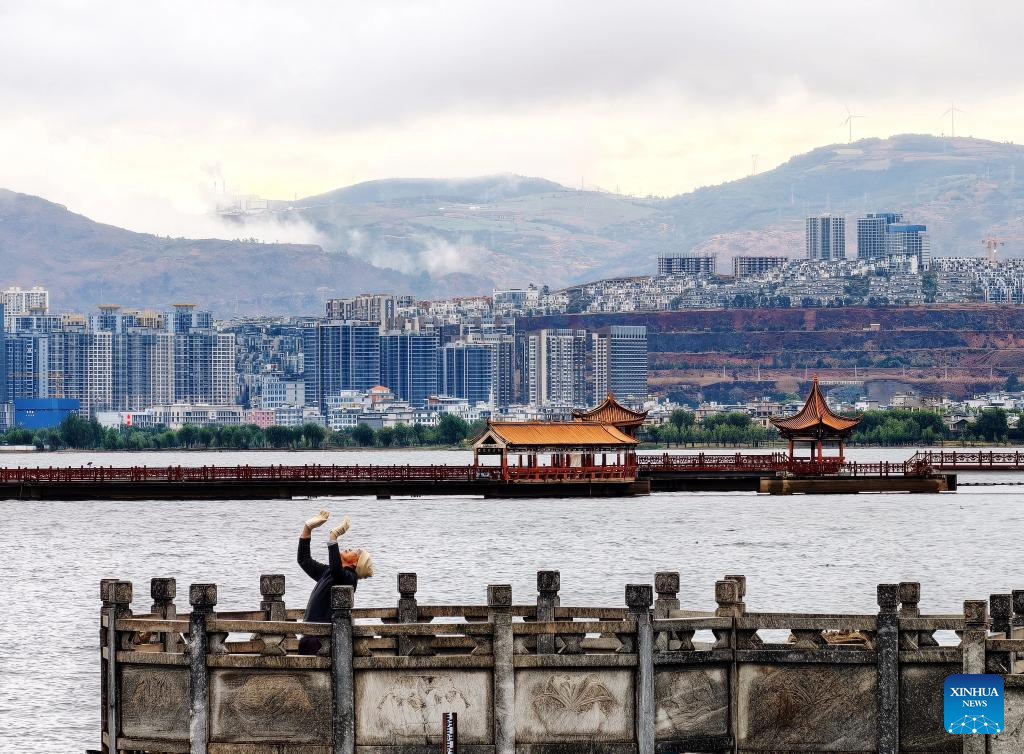 A resident does morning exercises by Erhai Lake in Dali, southwest China's Yunnan Province, April 29, 2026. (Xinhua/Xing Guangli)