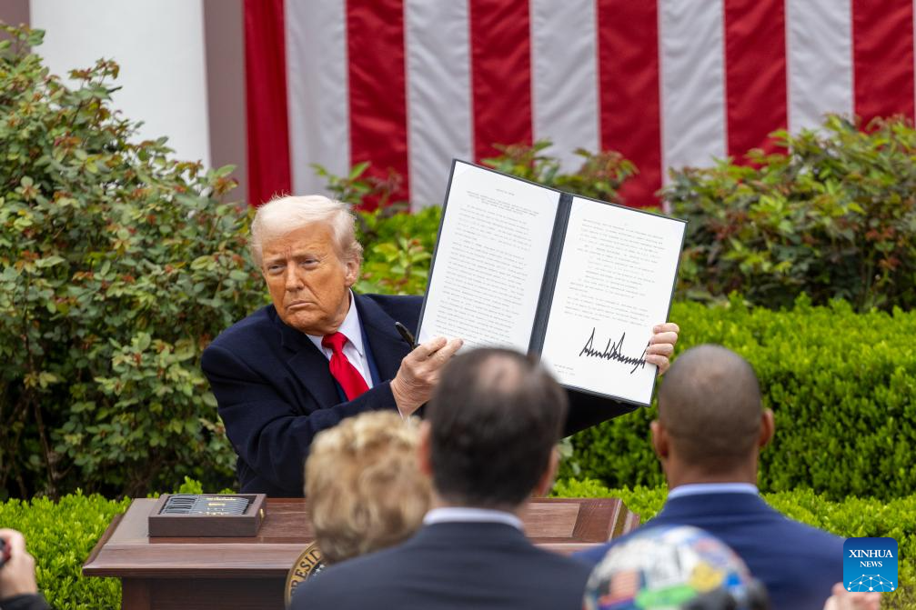 U.S. President Donald Trump shows an executive order on "reciprocal tariffs" at the Rose Garden of the White House in Washington, D.C., the United States, on April 2, 2025. (File photo: Xinhua)