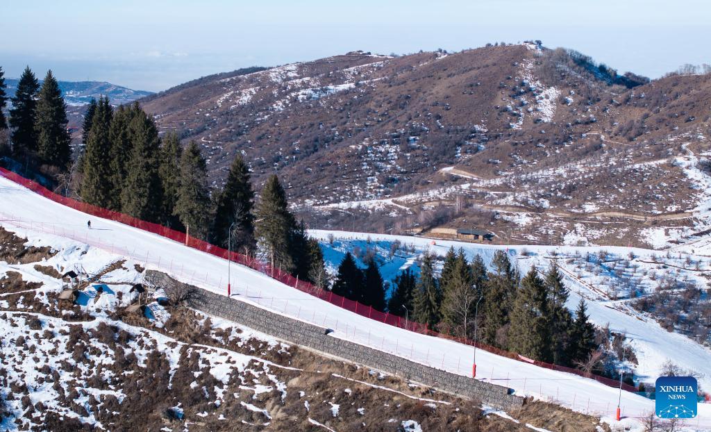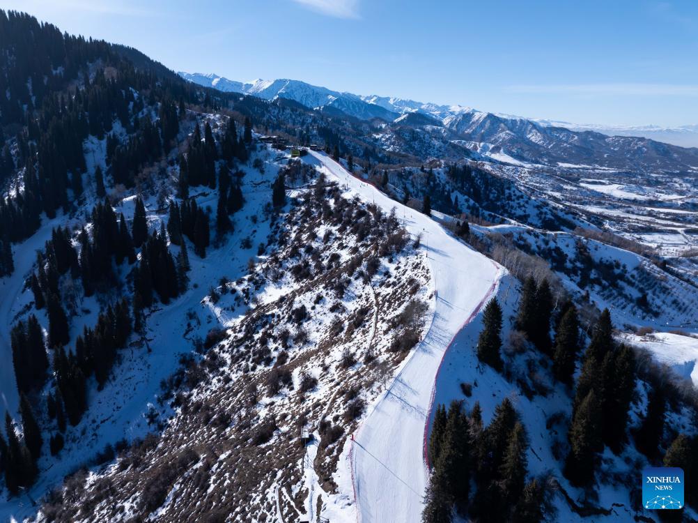 A drone photo taken on Jan. 13, 2026 shows a ski resort in Almaty, Kazakhstan. In winter, people of Almaty go outdoor to enjoy the fun of ice and snow sports. (Xinhua/Li Renzi)