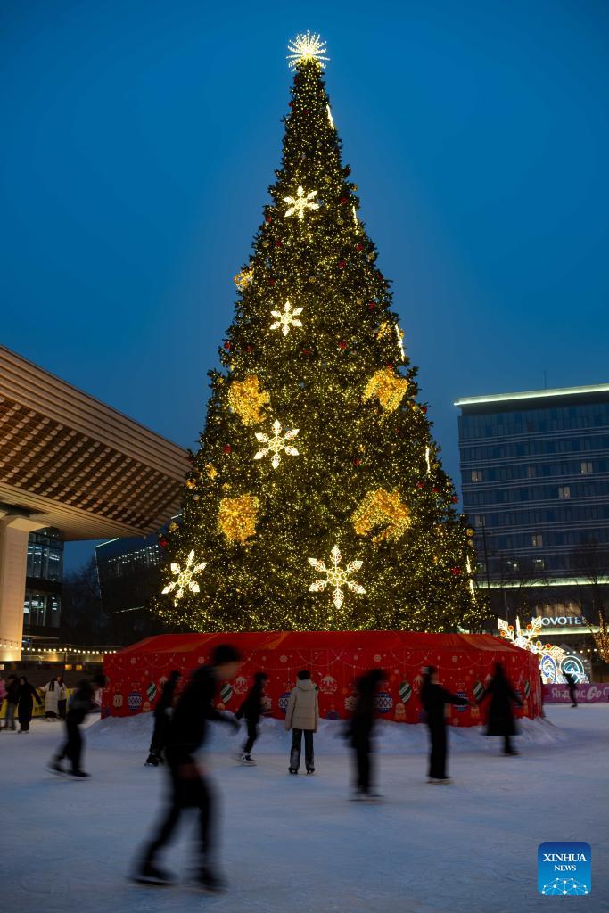 People skate at an ice rink in Almaty, Kazakhstan, on Jan. 14, 2026. In winter, people of Almaty go outdoor to enjoy the fun of ice and snow sports. (Xinhua/Li Renzi)