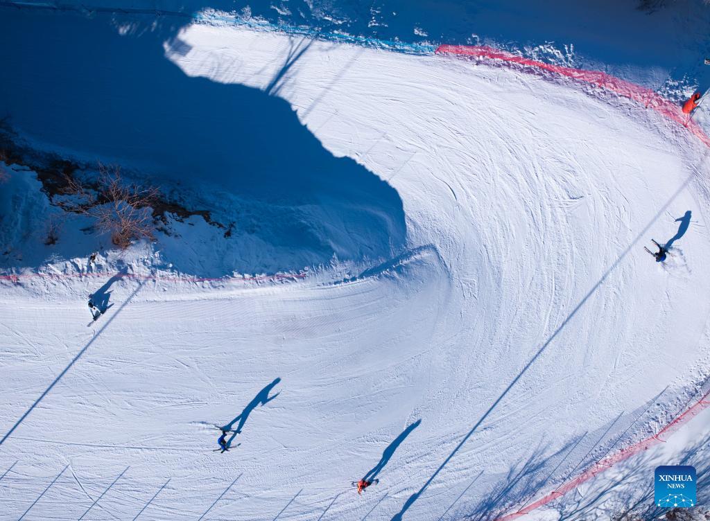 An aerial drone photo taken on Jan. 13, 2026 shows skiers skiing at a ski resort in Almaty, Kazakhstan. In winter, people of Almaty go outdoor to enjoy the fun of ice and snow sports. (Xinhua/Li Renzi)