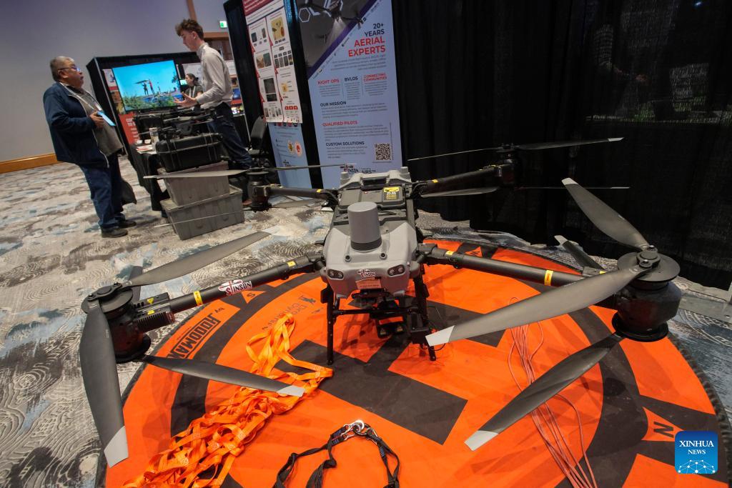 A forestry drone is on display during the 2026 Truck Loggers Association Convention and Trade Show in Vancouver, British Columbia, Canada, Jan. 15, 2026. (Photo by Liang Sen/Xinhua)