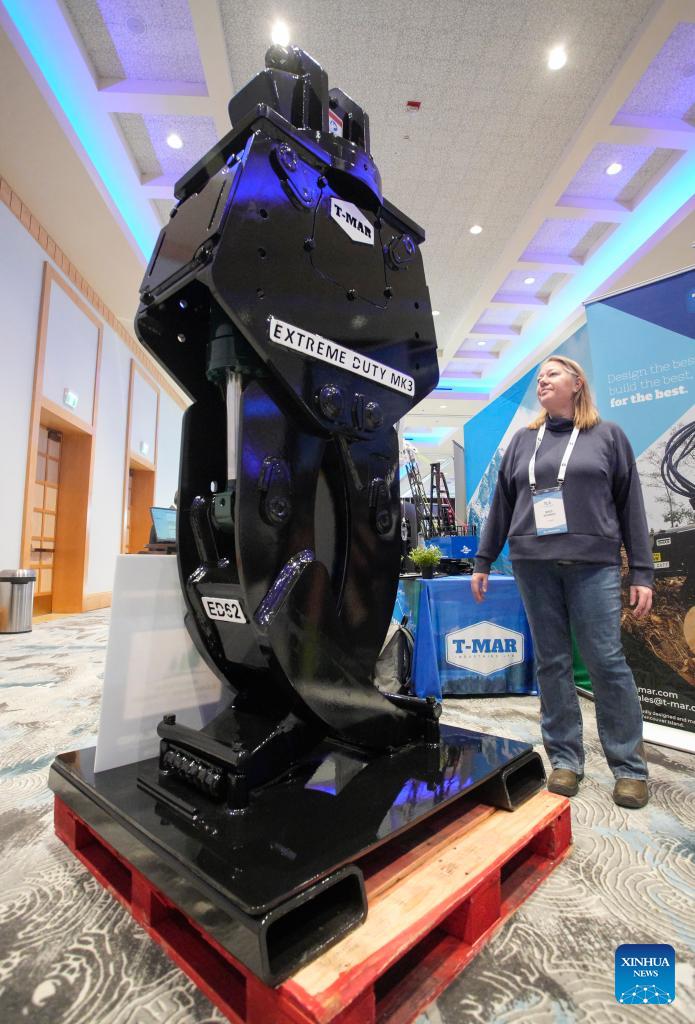 An attendee views a heavy-duty forestry grapple during the 2026 Truck Loggers Association Convention and Trade Show in Vancouver, British Columbia, Canada, Jan. 15, 2026. (Photo by Liang Sen/Xinhua)