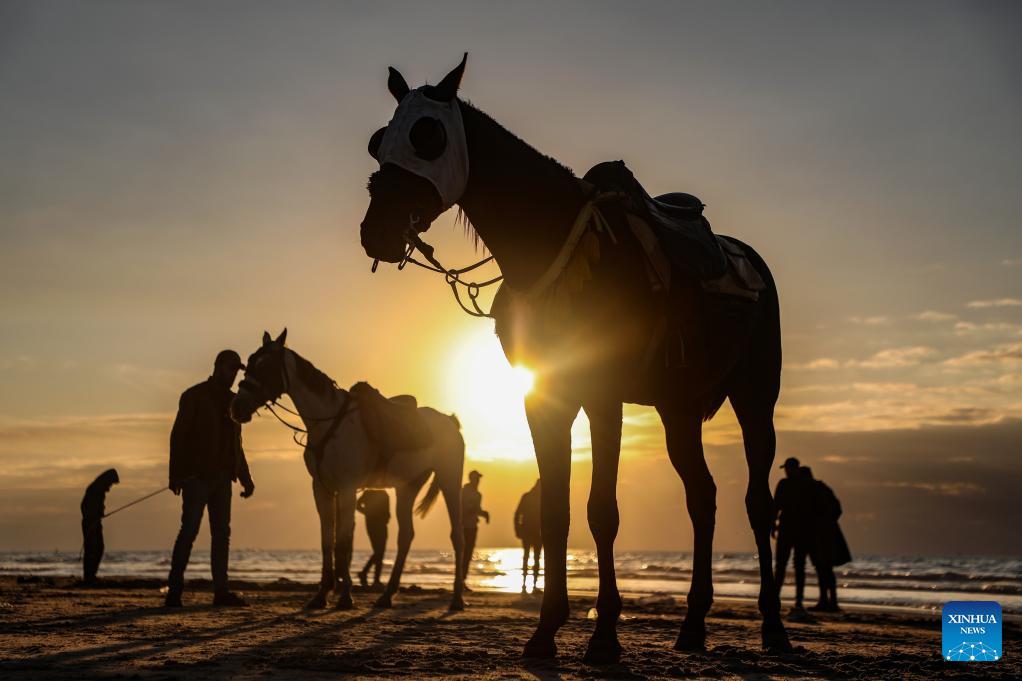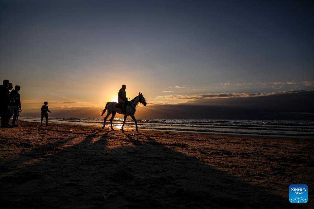 A Palestinian rides a horse on a beach in Gaza City at sunset, Jan. 16, 2026. (Photo by Rizek Abdeljawad/Xinhua)