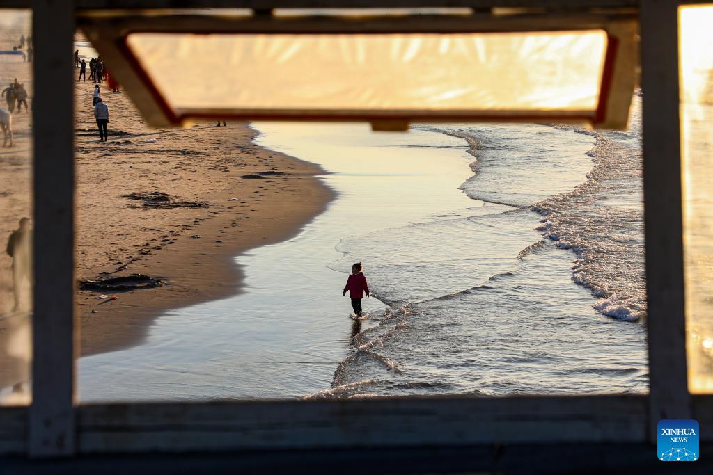 Palestinians spend time on a beach in Gaza City at sunset, Jan. 16, 2026. (Photo by Rizek Abdeljawad/Xinhua)