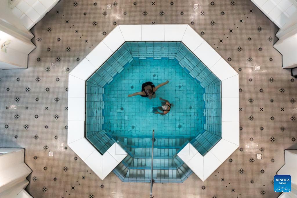 An aerial drone photo shows visitors enjoying a thermal bath in a pool at the Szechenyi Thermal Bath in Budapest, Hungary, Jan. 16, 2026. (Photo by David Balogh/Xinhua)