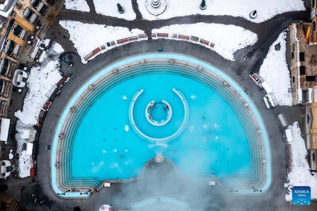 An aerial drone photo shows visitors enjoying a thermal bath in the open air pool at the Szechenyi Thermal Bath in Budapest, Hungary, Jan. 16, 2026. (Photo by David Balogh/Xinhua)