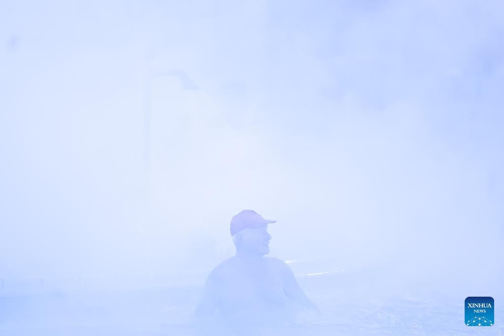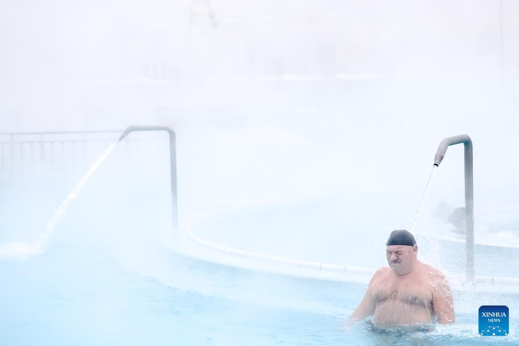 A man enjoys a thermal bath in the open air pool at the Szechenyi Thermal Bath in Budapest, Hungary on Jan. 16, 2026. (Photo by David Balogh/Xinhua)
