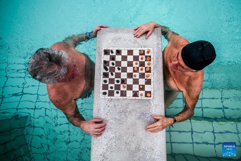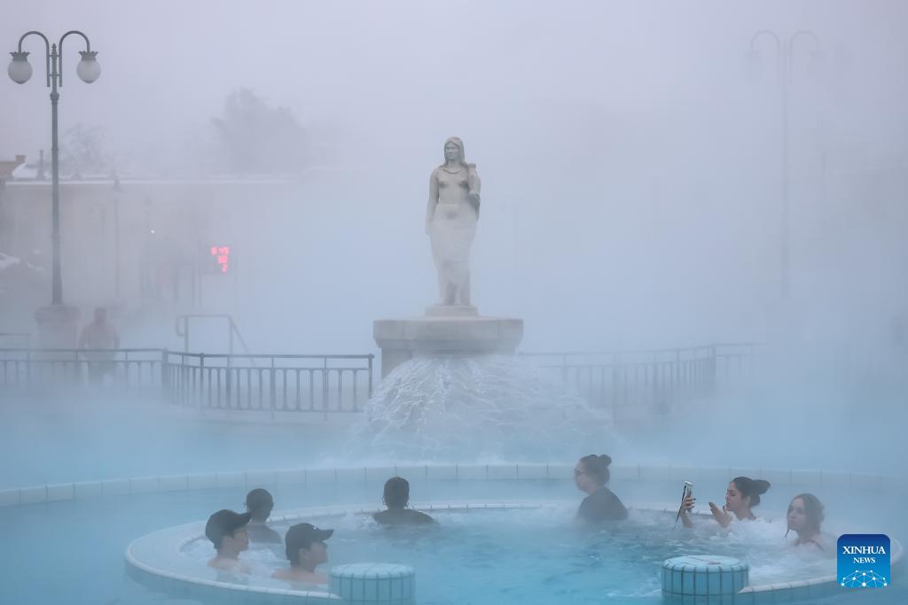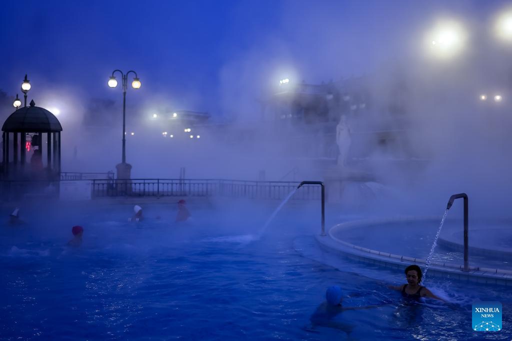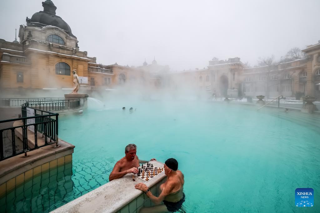 Visitors enjoy a thermal bath in the open air pool at the Szechenyi Thermal Bath in Budapest, Hungary on Jan. 16, 2026. (Photo by David Balogh/Xinhua)