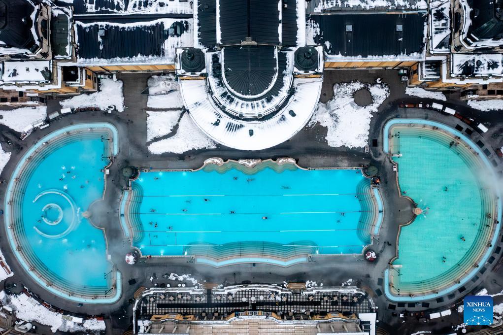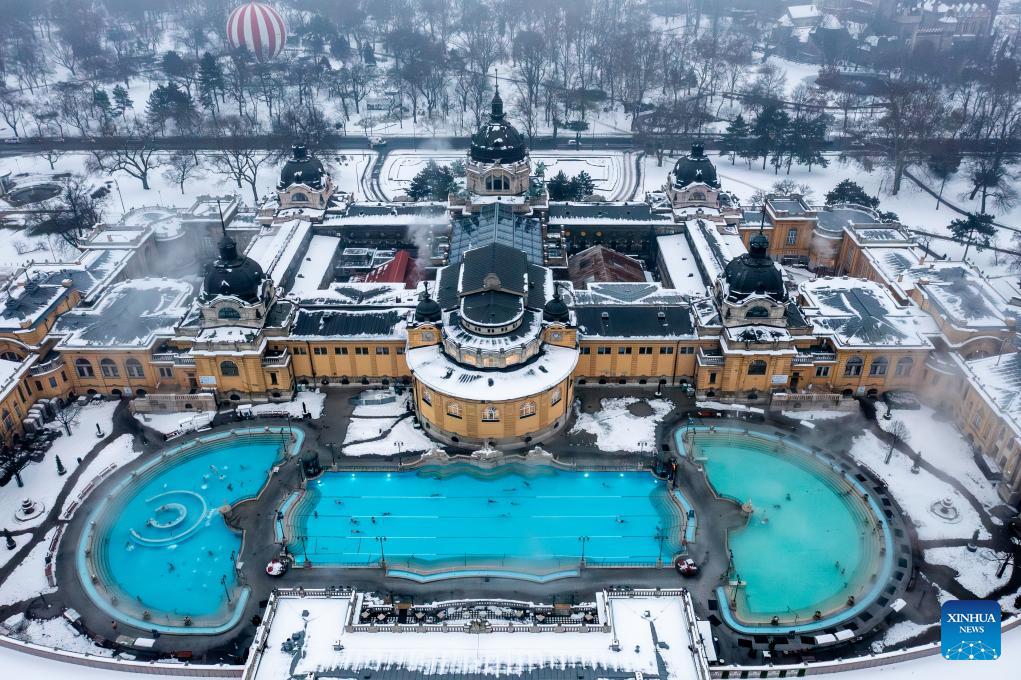 An aerial drone photo shows the snow-covered Szechenyi Thermal Bath in Budapest, Hungary, Jan. 16, 2026. (Photo by David Balogh/Xinhua)