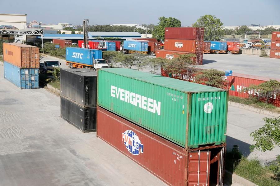 Photo taken on Jan. 13, 2022 shows containers at the Hong Leng Huor Dry Port on the western suburb of Phnom Penh, Cambodia. (Photo by Phearum/Xinhua)