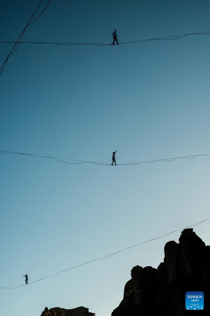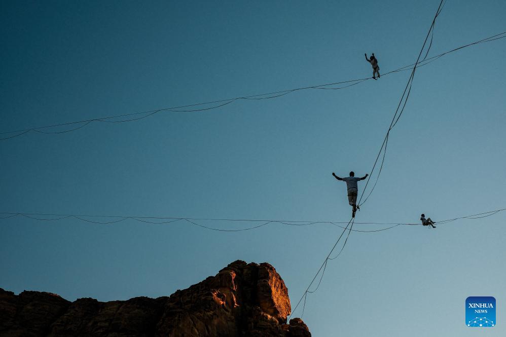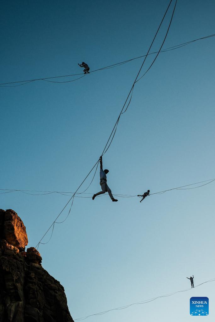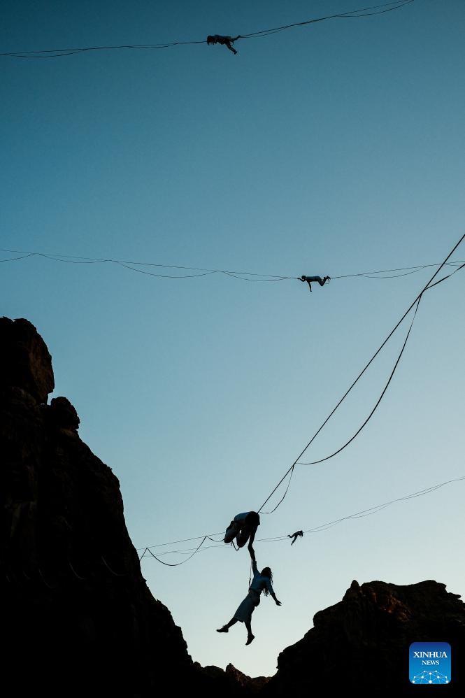 Acrobats present an aerial art performance titled Vertigo in AlUla, Saudi Arabia, Jan. 16, 2026. Originally presented in Paris, Vertigo combines highlining, acrobatics and immersive music to explore gravity, self-transcendence and the power of solidarity through the performers' dynamic interaction with space. (Xinhua/Xin Mengchen)