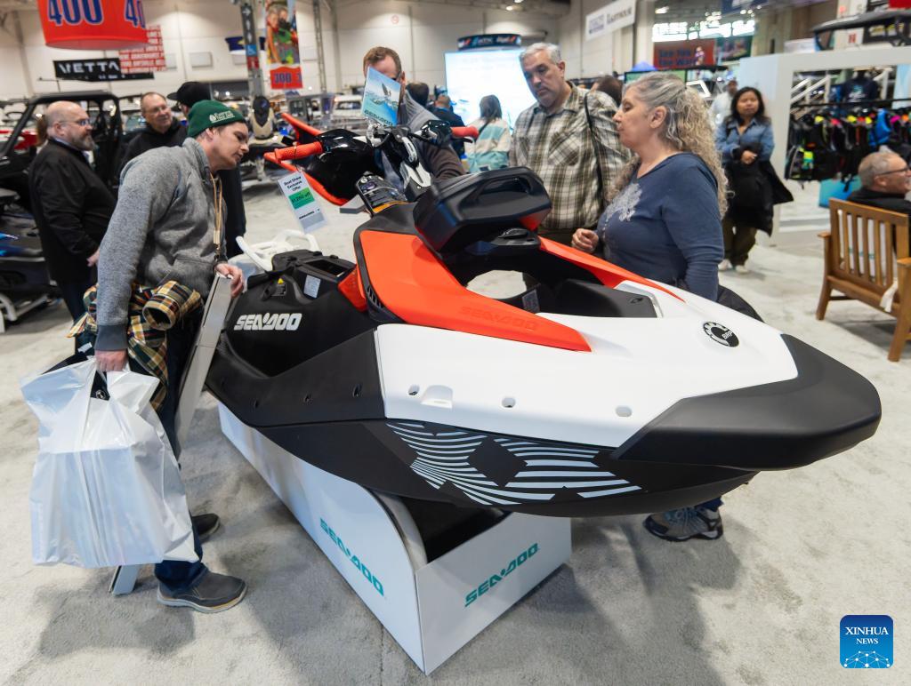 People look at a jet ski during the 2026 Toronto International Boat Show in Toronto, Canada, on Jan. 17, 2026. Showcasing more than 1, 000 boats of all sizes, the annual event kicked off here on Saturday and will last until Jan. 25 this year. (Photo by Zou Zheng/Xinhua)