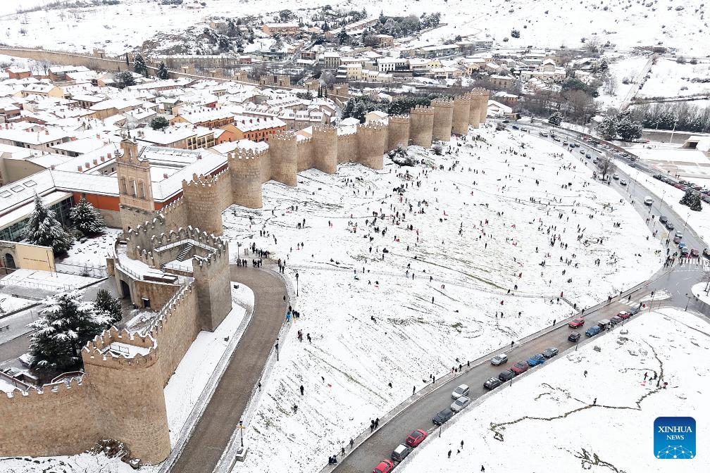 An aerial drone photo taken on Jan. 17, 2026 shows a view of the snow-covered Avila, Spain. Avila is renowned as a UNESCO World Heritage Site for its well-preserved medieval walls, built in the 11th century and stretching about 2.5 kilometers. (Xinhua/Meng Dingbo)