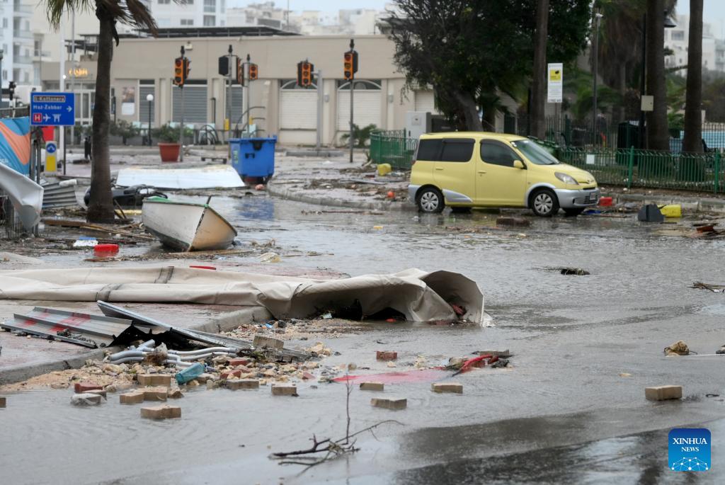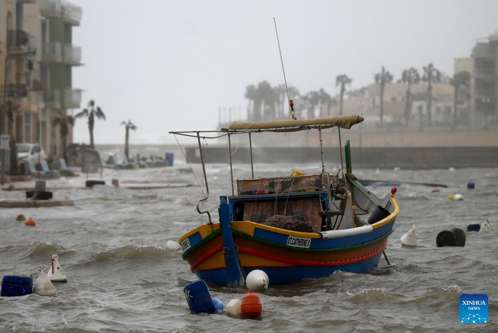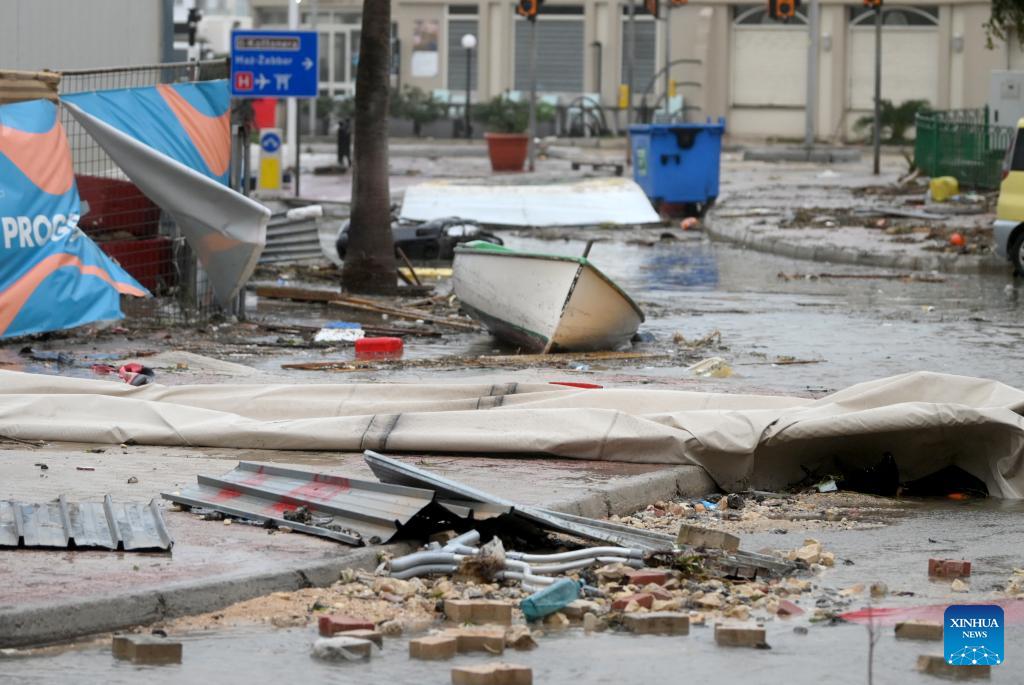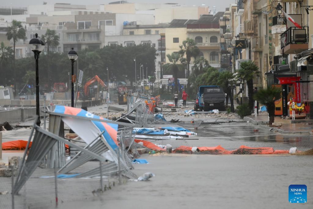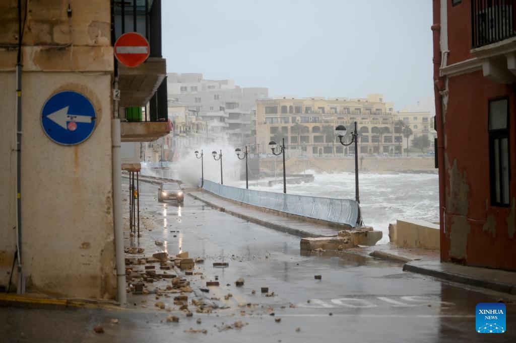 This photo taken on Jan. 20, 2026 shows a street affected by Storm Harry in Marsascala, eastern Malta. The coast of Malta was hit by strong winds and high waves as Storm Harry battered its islands. (Photo by Jonathan Borg/Xinhua)