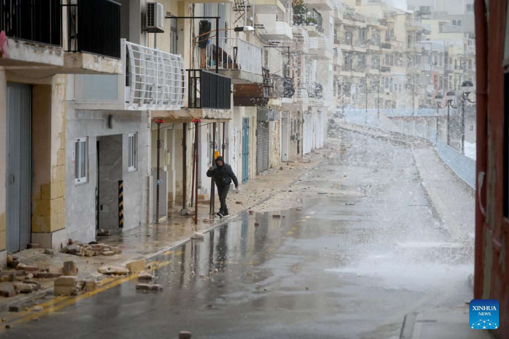 A pedestrian walks on a street affected by Storm Harry in Marsascala, eastern Malta, Jan. 20, 2026. The coast of Malta was hit by strong winds and high waves as Storm Harry battered its islands. (Photo by Jonathan Borg/Xinhua)