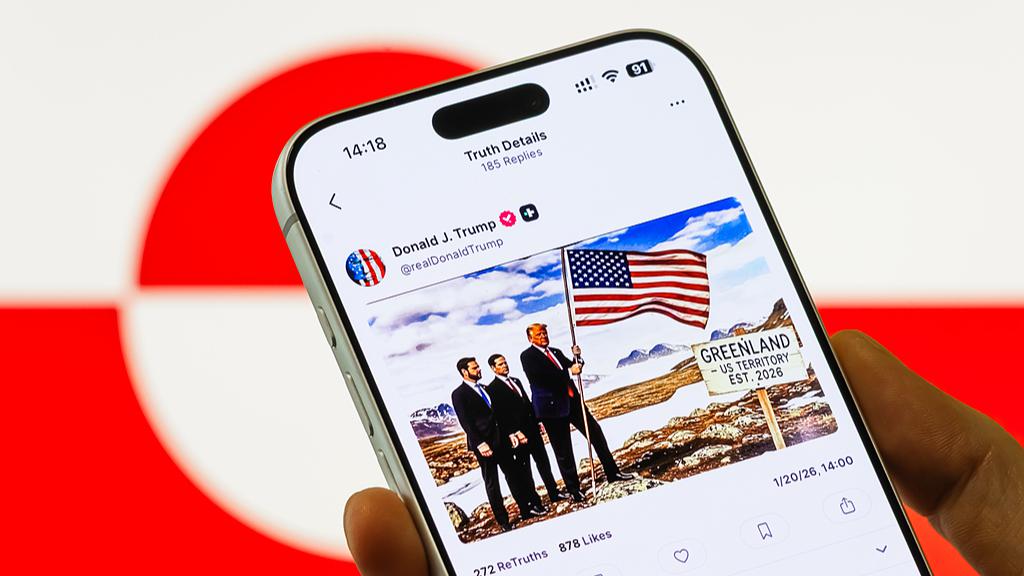 A smartphone displays a post by U.S. President Donald Trump on the Truth Social platform showing a composite image featuring Trump alongside U.S. Senator Marco Rubio and U.S. Senator J.D. Vance, with the U.S. flag visible and a sign reading Greenland, U.S. Territory Est. 2026, set against the Greenland flag in the background, January 20, 2026. (Photo: VCG)