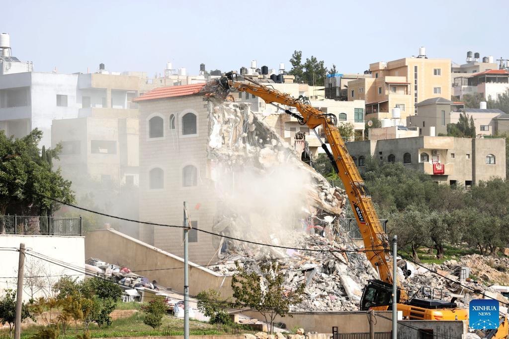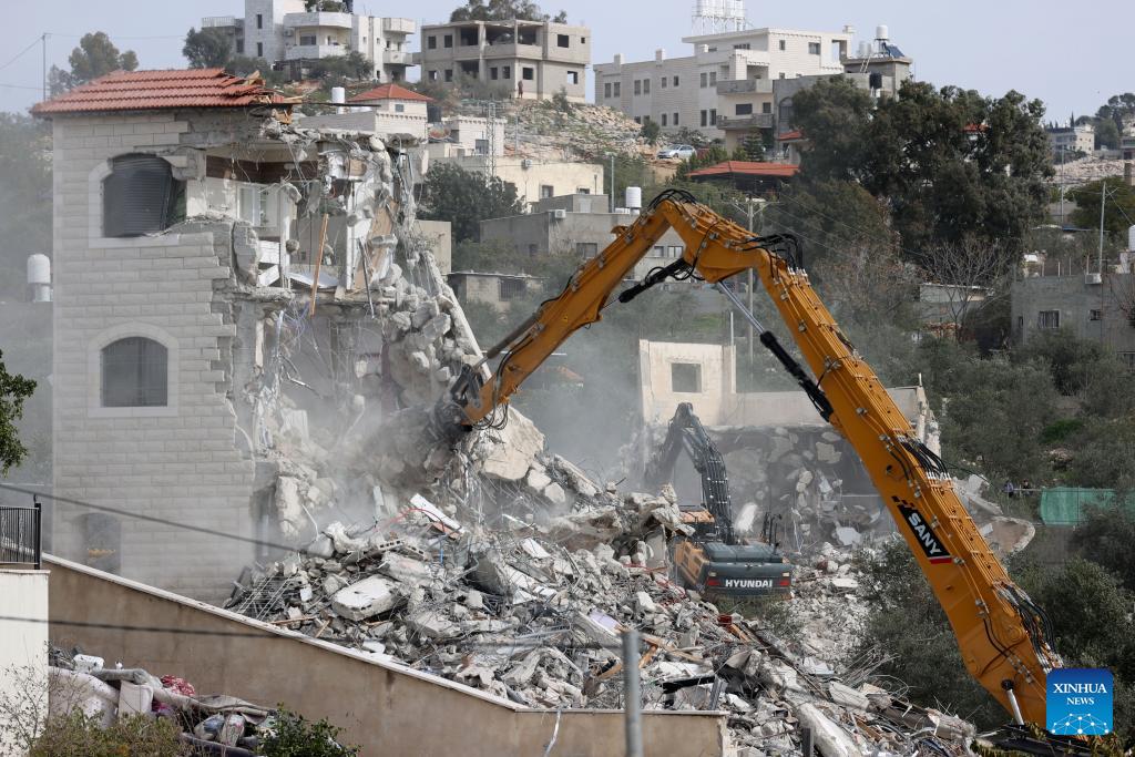 An Israeli excavator demolishes a Palestinian house in the village of Shuqba, west of Ramallah in the central West Bank, on Jan. 21, 2026. On Wednesday, Israeli forces demolished three Palestinian homes in the village of Shuqba, citing the lack of building permits, Palestinian sources said. (Photo by Nidal Eshtayeh/Xinhua)
