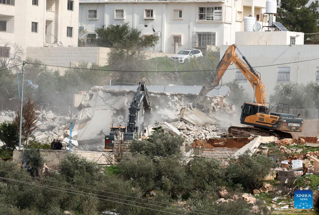 Israeli excavators demolish a Palestinian house in the village of Shuqba, west of Ramallah in the central West Bank, on Jan. 21, 2026. On Wednesday, Israeli forces demolished three Palestinian homes in the village of Shuqba, citing the lack of building permits, Palestinian sources said. (Photo by Nidal Eshtayeh/Xinhua)