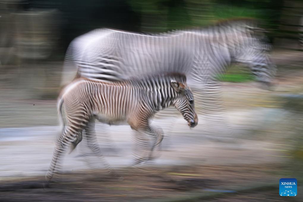 A female zebra foal gallops alongside an adult zebra at the Singapore Zoo in Singapore, Jan. 22, 2026. The zebra foal was born here on Dec. 2, 2025. (Photo by Then Chih Wey/Xinhua)